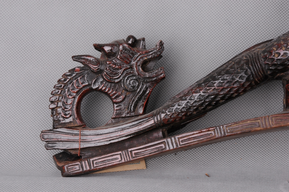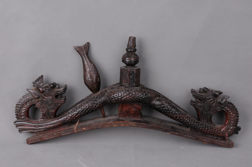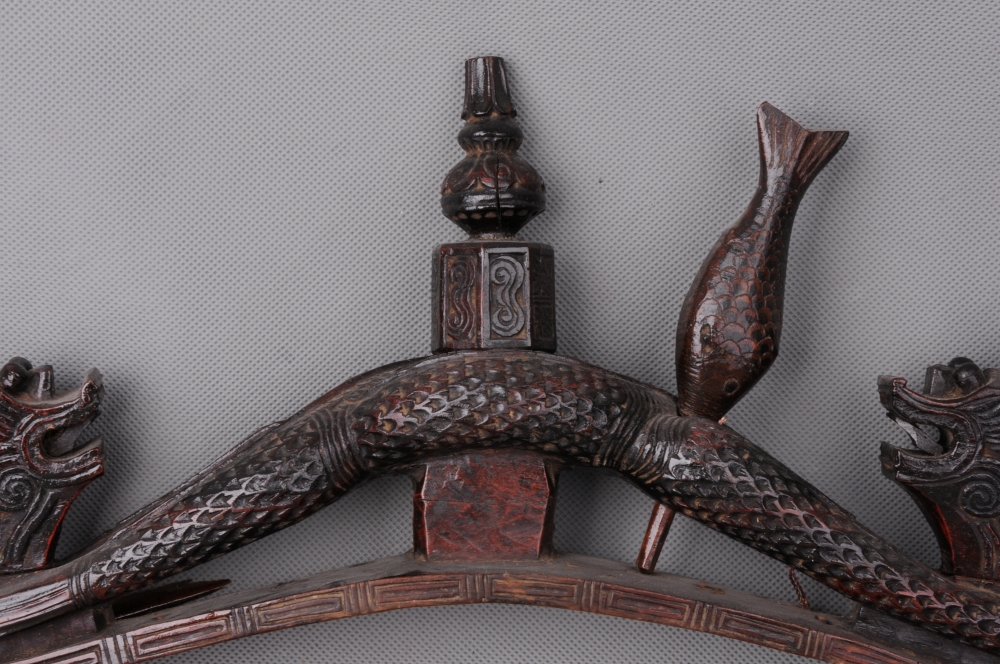 黔东南州民族博物馆收藏的这套斗牛背饰征集于1986年从江县高增乡银良村,由龙纹木雕鞍和三面三角彩色令旗组成。整体通长45厘米,座高21.5厘米,雕鞍底座弧形,两条龙凌空交织盘旋,龙头回望,正中为葫芦塔型雕刻装饰,其间一木雕鱼倒插于龙身(原鞍应为一对木雕鱼,征集时已缺失一),三面令旗分别插于龙首和正中。背饰雕刻栩栩如生,色彩强调质朴与原始之美,体现了侗族崇尚自然、返璞归真的审美理念。